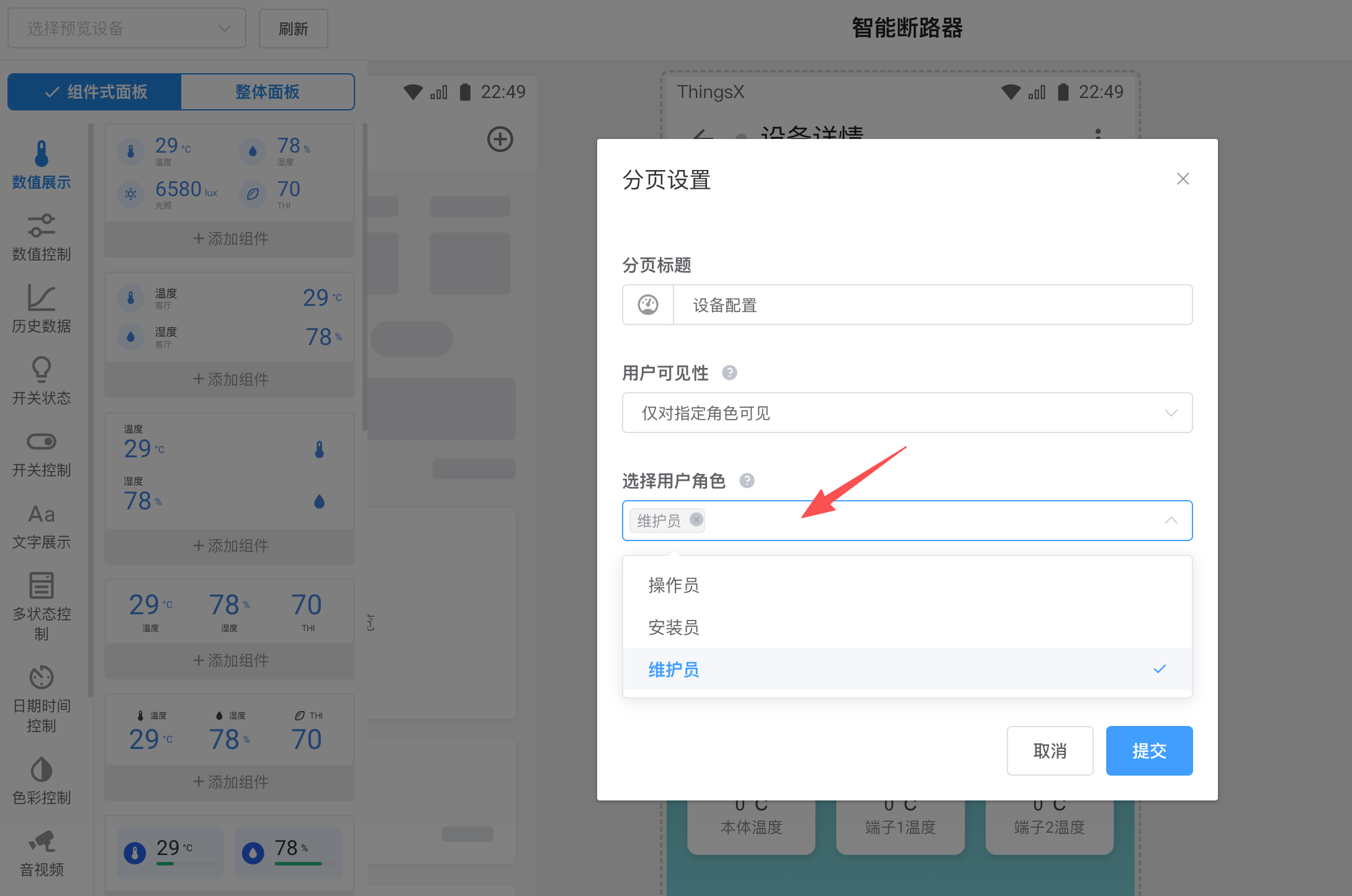 用户角色还用在 ThingsX 设备面板组件的可见性选项中,您可以设置组件仅对特定的角色可见或不可见。如下图:
