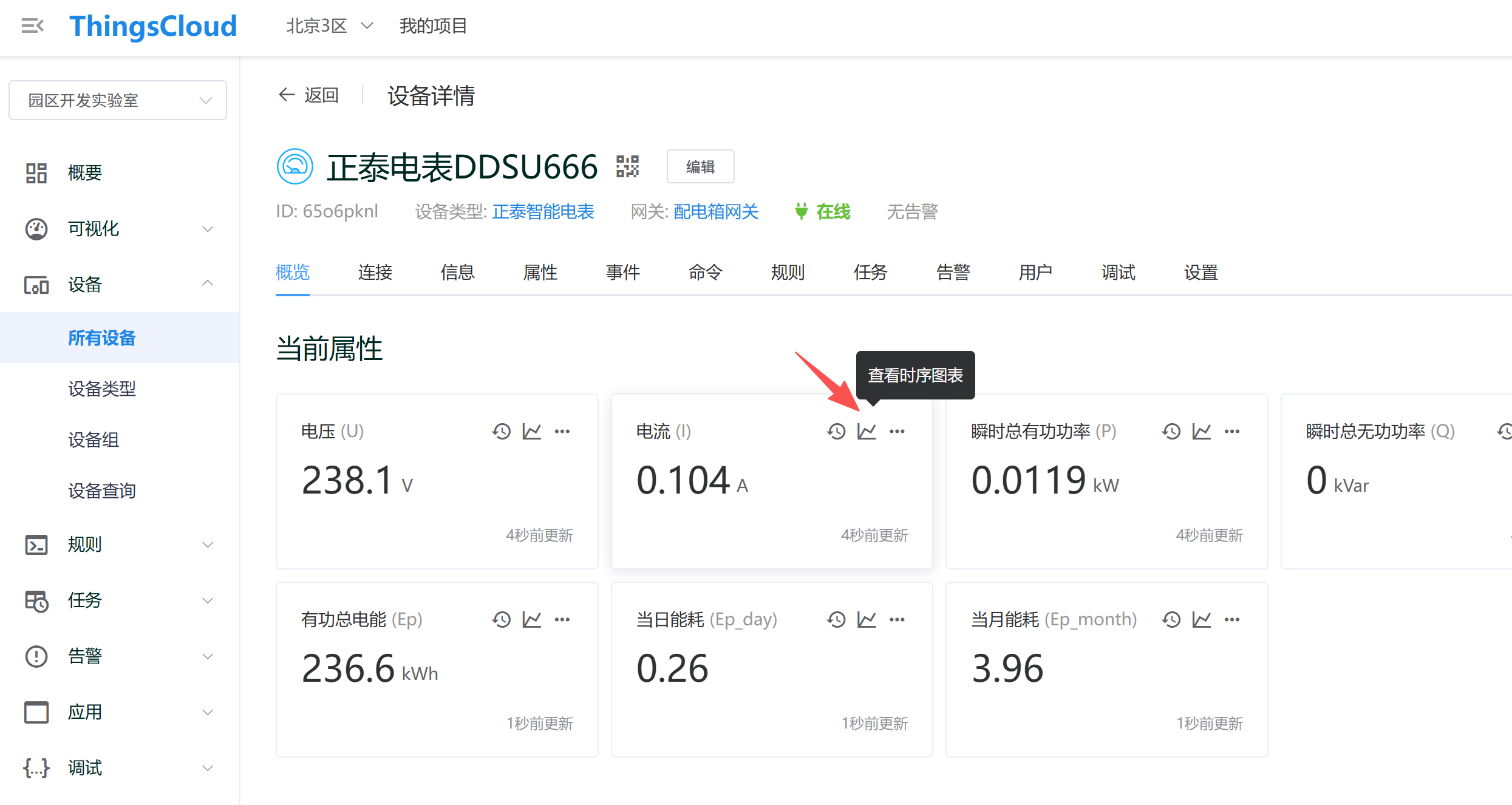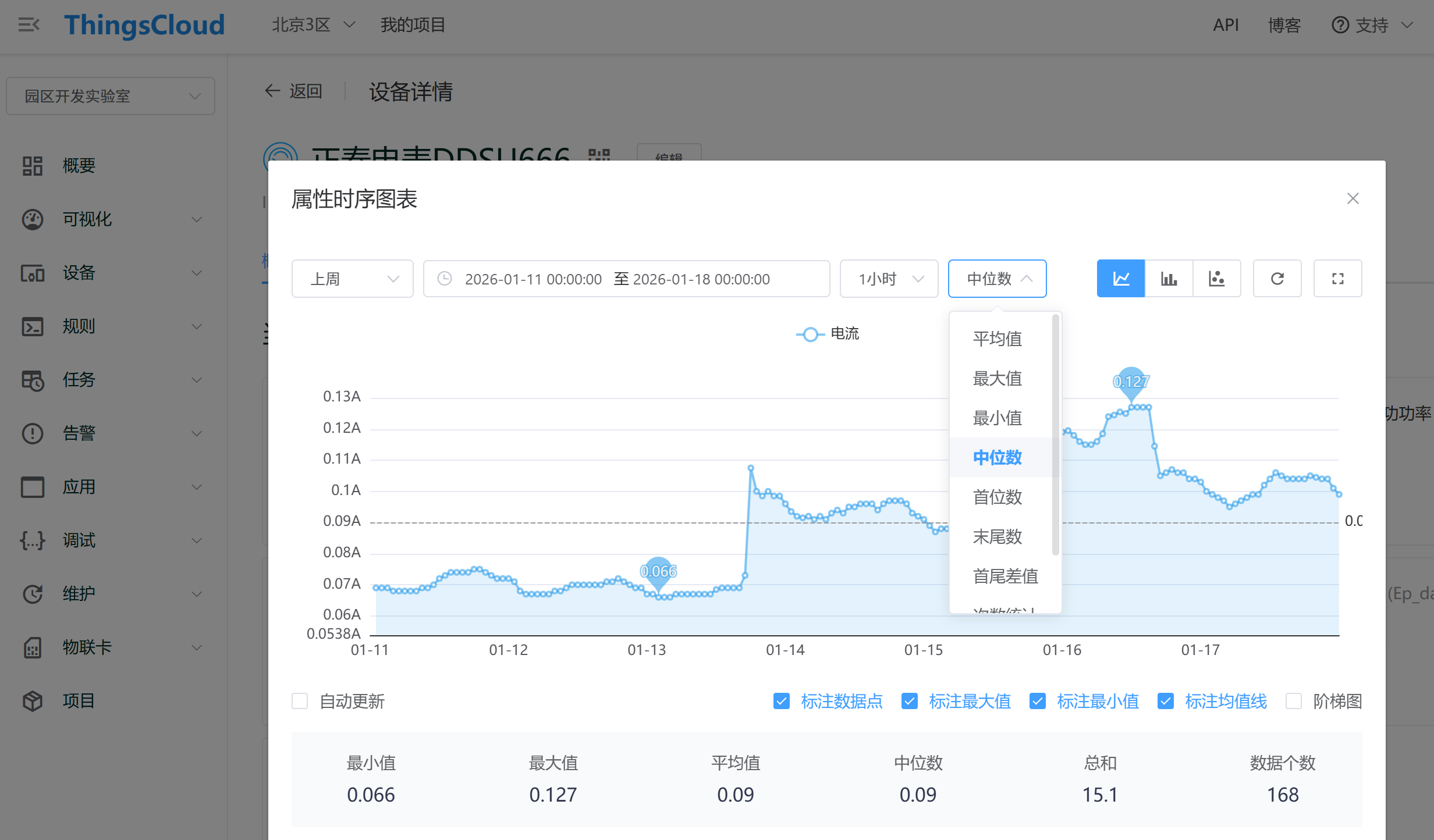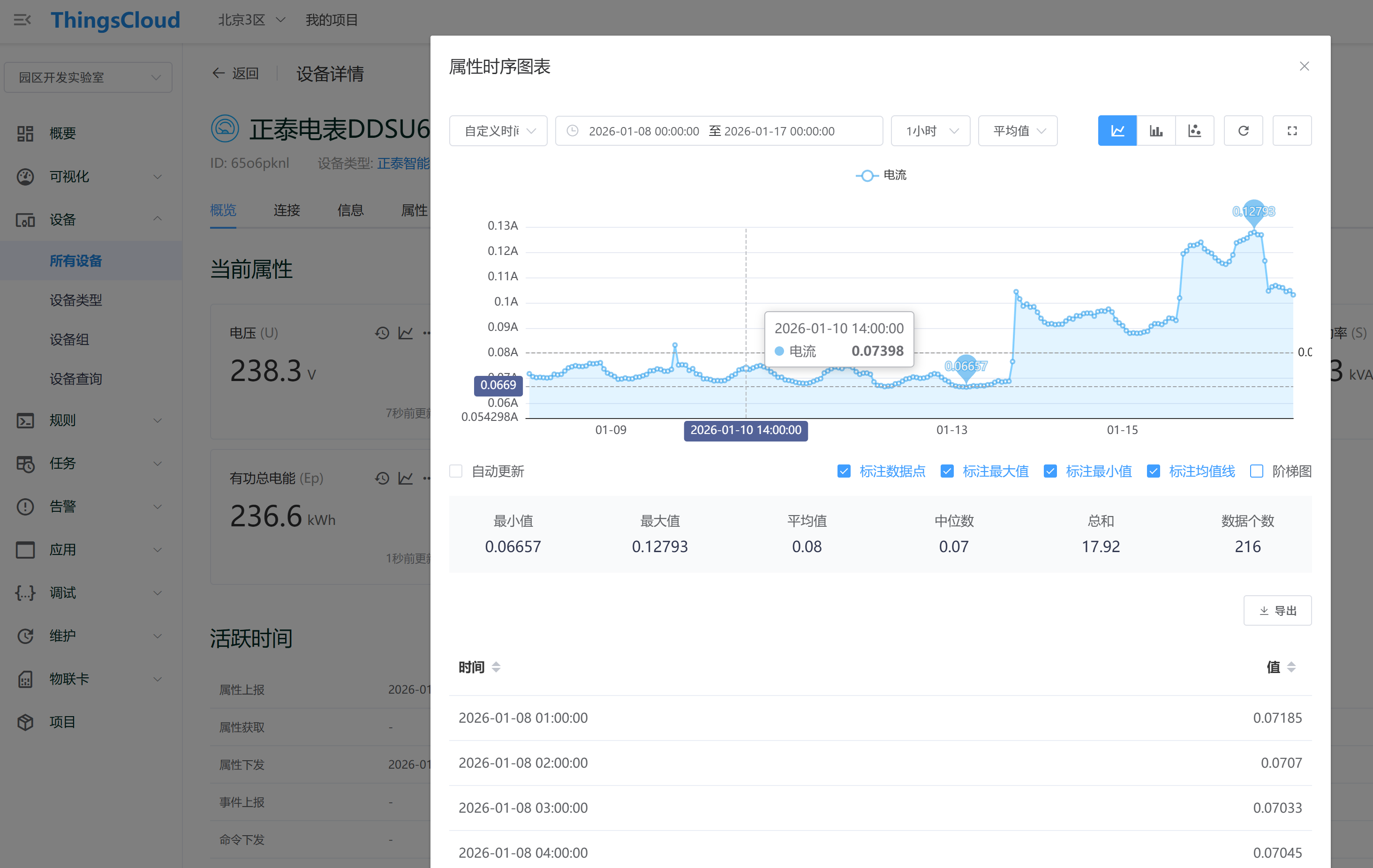 ThingsCloud 为数值类型的属性提供时序图表功能,帮助您直观地查看属性值随时间的变化趋势。通过时序图表,您可以快速识别数据异常、分析变化规律、监控设备状态,为设备管理和优化决策提供数据支持。